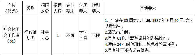 因工作需要,現(xiàn)清城區(qū)總工會(huì)面向社會(huì)公開招聘1名社會(huì)化工會(huì)工作者(屬非編制人員,不列入用人單位編制序列,不擔(dān)任行政職務(wù)),現(xiàn)將有關(guān)事項(xiàng)公告如下: