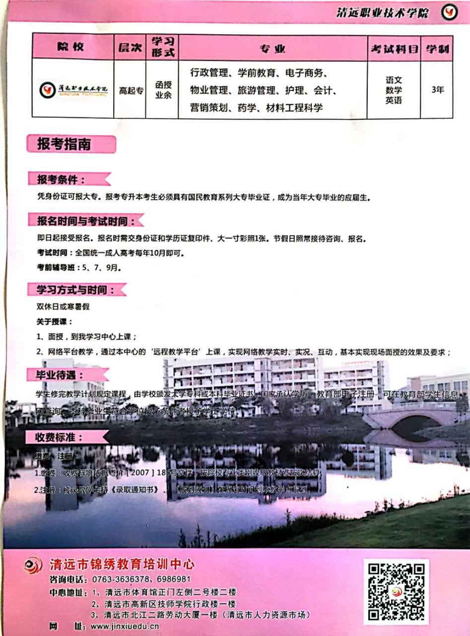 北京大學(xué)、清遠(yuǎn)職業(yè)技術(shù)學(xué)院圓夢計劃正式啟動,三年學(xué)費只需5000元,考試前一百名三年學(xué)費只需1000元,心動不如行動,趕快加入圓夢計劃吧!咨詢熱線:0763-3630112 報名地址:清遠(yuǎn)市北江二路勞動大廈一樓