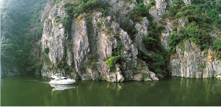 乘坐在快艇上乘風(fēng)破浪,在江面上疾馳,兩岸的青山巍峨聳立,偶有成群的白鷺在江面上拍著翅膀飛過(guò),不遠(yuǎn)處還有農(nóng)舍、田園,眼前的景色就像一幅優(yōu)美的山水畫(huà)。唐代名相張九齡就在其詩(shī)作《湞陽(yáng)峽》中寫(xiě)道:“行舟傍越岑,窈窕越溪深。水暗先秋冷,山晴當(dāng)晝陰”,表現(xiàn)了峽谷的幽深。即將開(kāi)通的廣樂(lè)高速,也有架橋在江面上經(jīng)過(guò),那巨大高聳的橋梁,本身也是一景。現(xiàn)代化的橋梁與古樸的江景相映成趣,“一橋飛架南北”的景觀讓人嘆為觀止。景區(qū)所提供的快艇也是全新的,里面電視、音響、洗手間、酒吧等一應(yīng)俱全,與友人在這里一邊品茶一邊欣賞兩岸景色,美哉快哉!